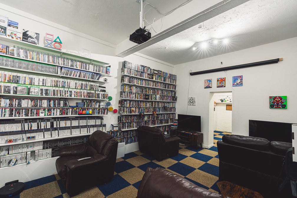 Features two two-seater couches and two single seat armchairs. There is a single four seat glass D&D table with TV. This room hosts the majority of our console games and movie collection. The west doorway leads to the Kitchen and the east doorway to the Arcade.