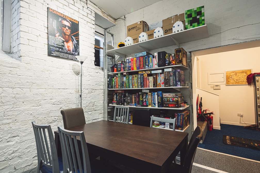 The north wall has the windows, and on west most window bay is the Main Room PC connected to the TV as well as a blu ray player. The PC has four wireless controllers and specialises in 4 player split screen games.